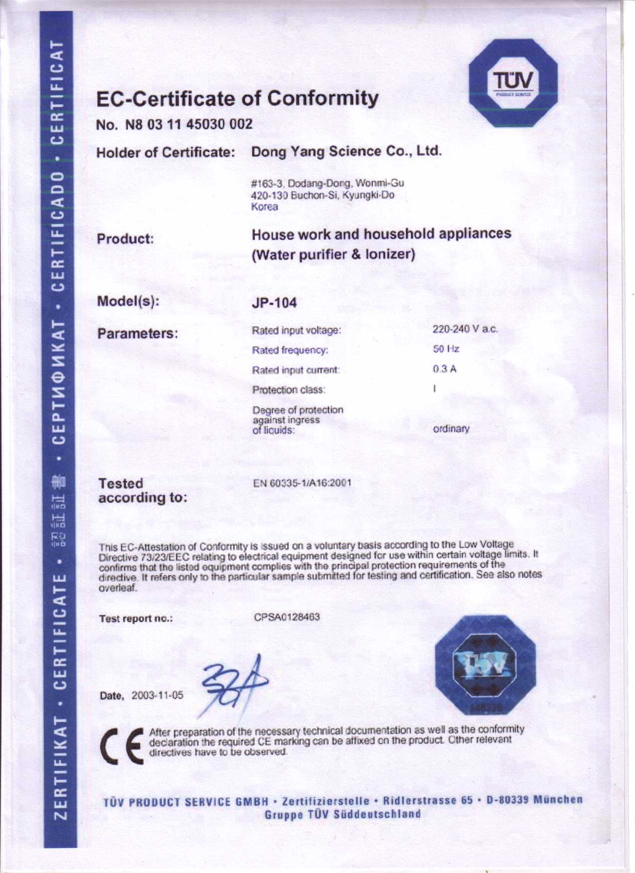 <p class="mainl"> They are. The latest models are also currently undergoing US "UL" approval plus US NSF approval. See the International CE certificate <a href="../images/alkalinewater/CE_CERT.jpg" width="354" height="487"><strong>Here</strong></a>. </p>