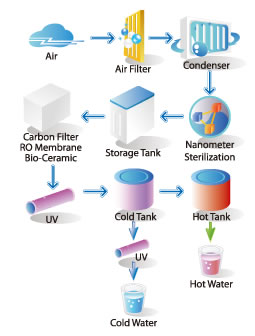 <p class="mainl">To ensure the purified drinking water, EcoloBlue&trade; uses a multi-stage filtration system free of chemicals, using the &ldquo;Reverse Osmosis&rdquo; and the &ldquo;Ultra Violet&rdquo; filters,   while the &ldquo;Electrostatic Anti-bacteria &amp; Anti-fungus&rdquo; filter is cleaning the   air in your home/office. The water ready for drinking can be hot or cold 200F or   40F (95c or 5c); a feature also available on all 5 industrial machines. All the   AWG machines can be connected to a city water main line and &ldquo;play the role&rdquo; of   only filtering the water.</p>